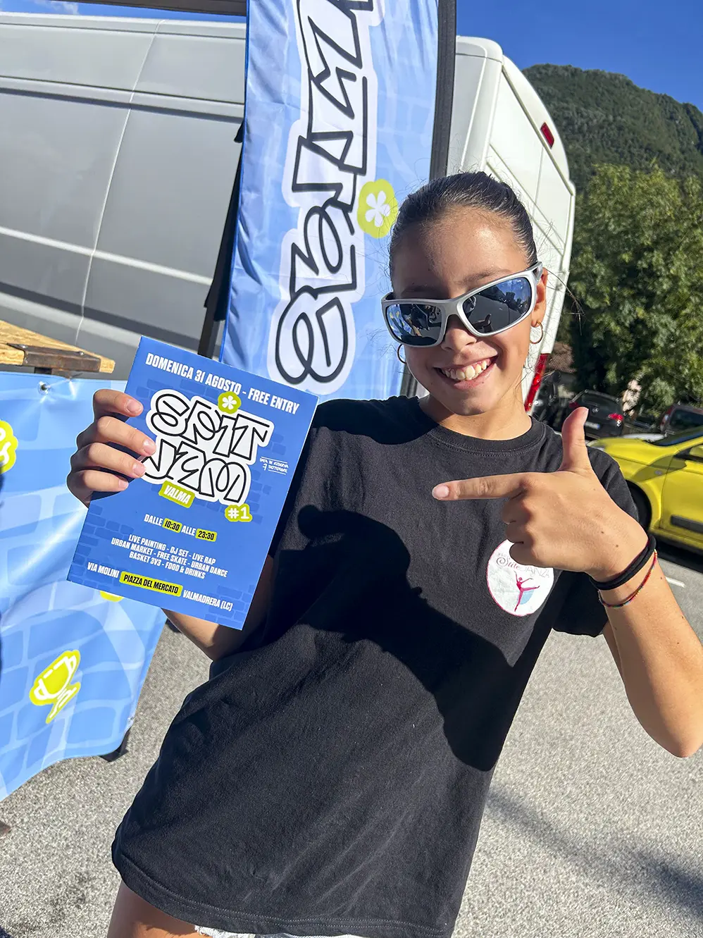 celeste fatta di sogno, innovazione e infinito. Intorno, foglioline verde acqua evocano la natura di Valmadrera,