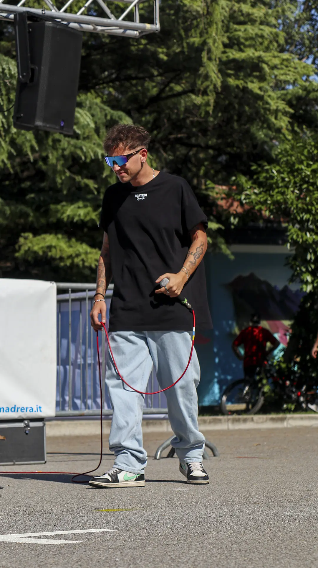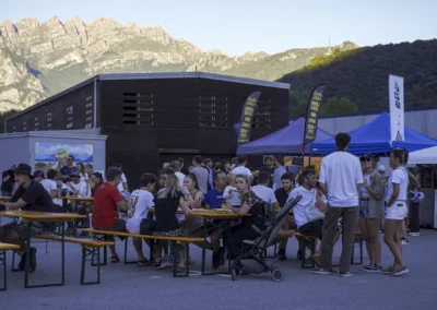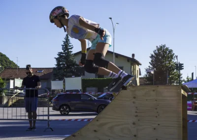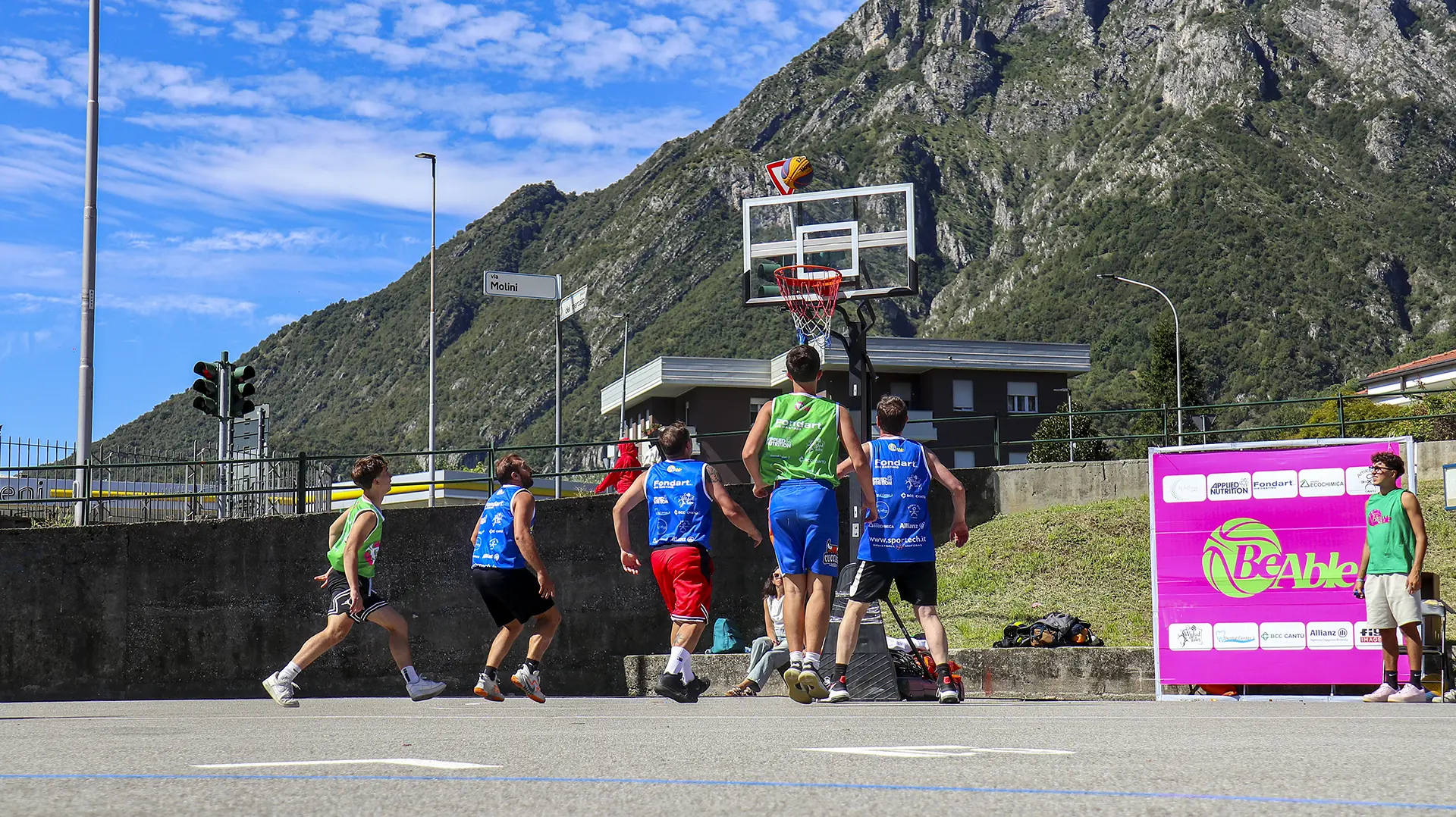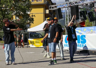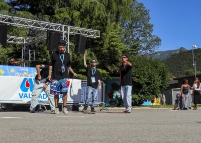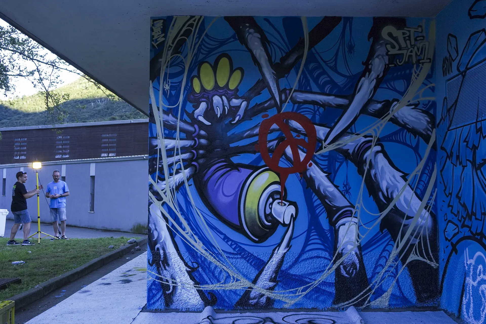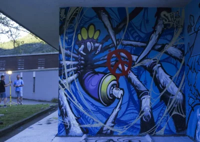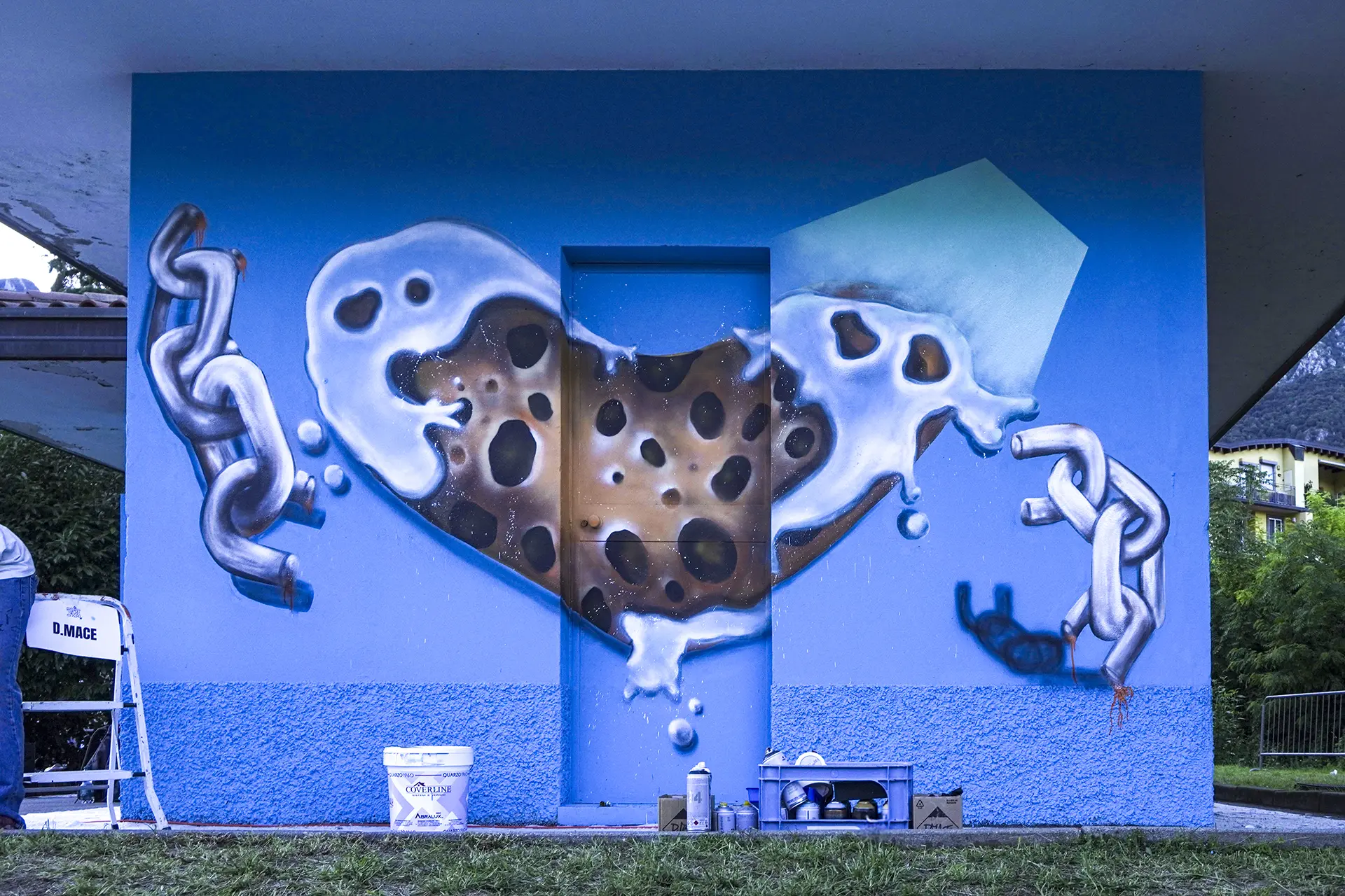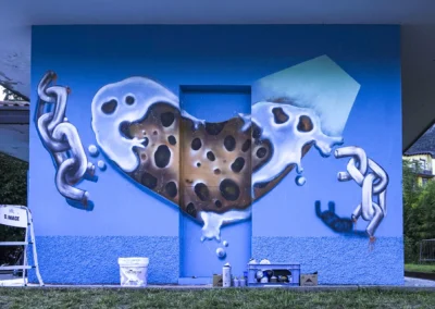 La città che cresce e respira ha bisogno di un cuore che batta al ritmo giusto, ma anche di un cuore che sappia ancora sentire e non sia atrofizzato. Ispirandomi al tema proposto, il mio murale raffigura il motore di un essere vivente: una città composta in equilibrio dalla roccia montuosa, che però respira e, porosa, si lascia oltrepassare trattenendo il meglio; e dall’acqua del lago, che la avvolge e la custodisce senza imbrigliarla. L’acqua, fluida, scorre attorno: è un cuore che, sullo sfondo, lascia in ombra le catene arrugginite di un passato industriale, per illuminarsi con qualcosa di nuovo che arriva. Un cuore che vuole rimanere umano, e continuare a sentire, senza