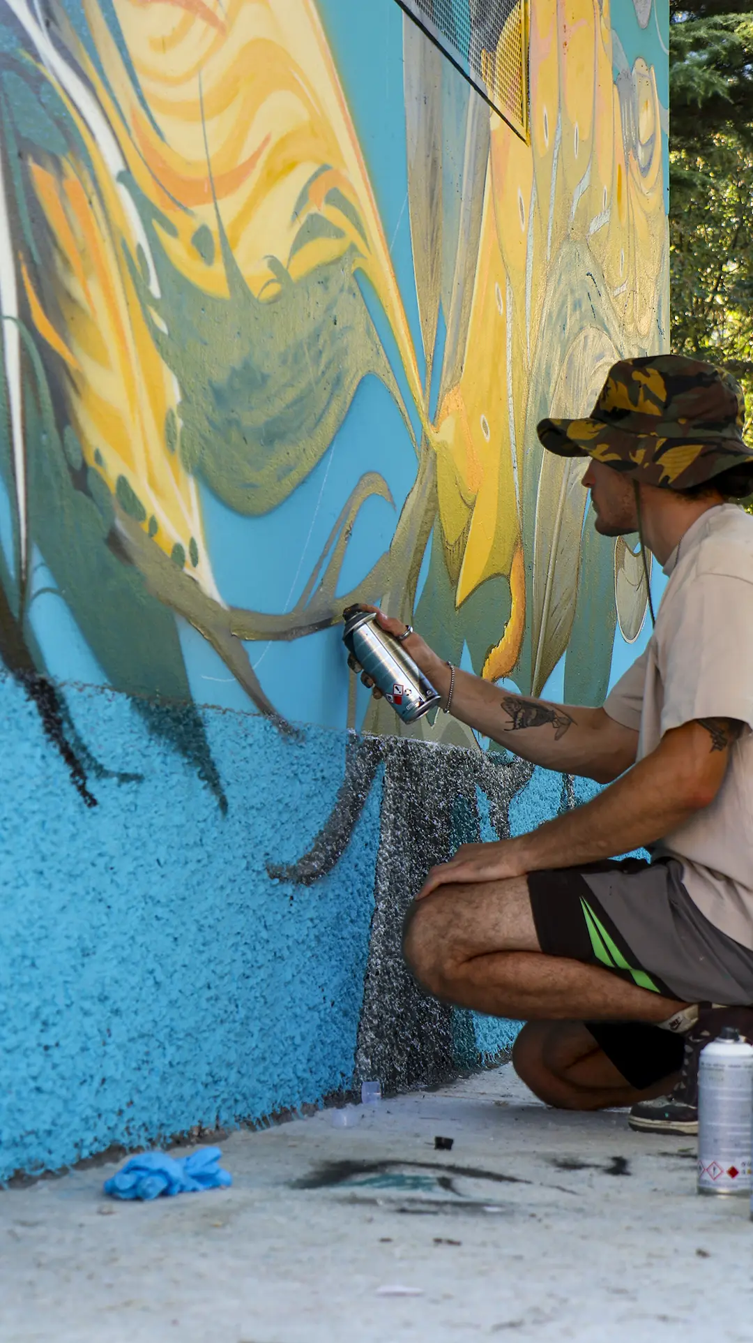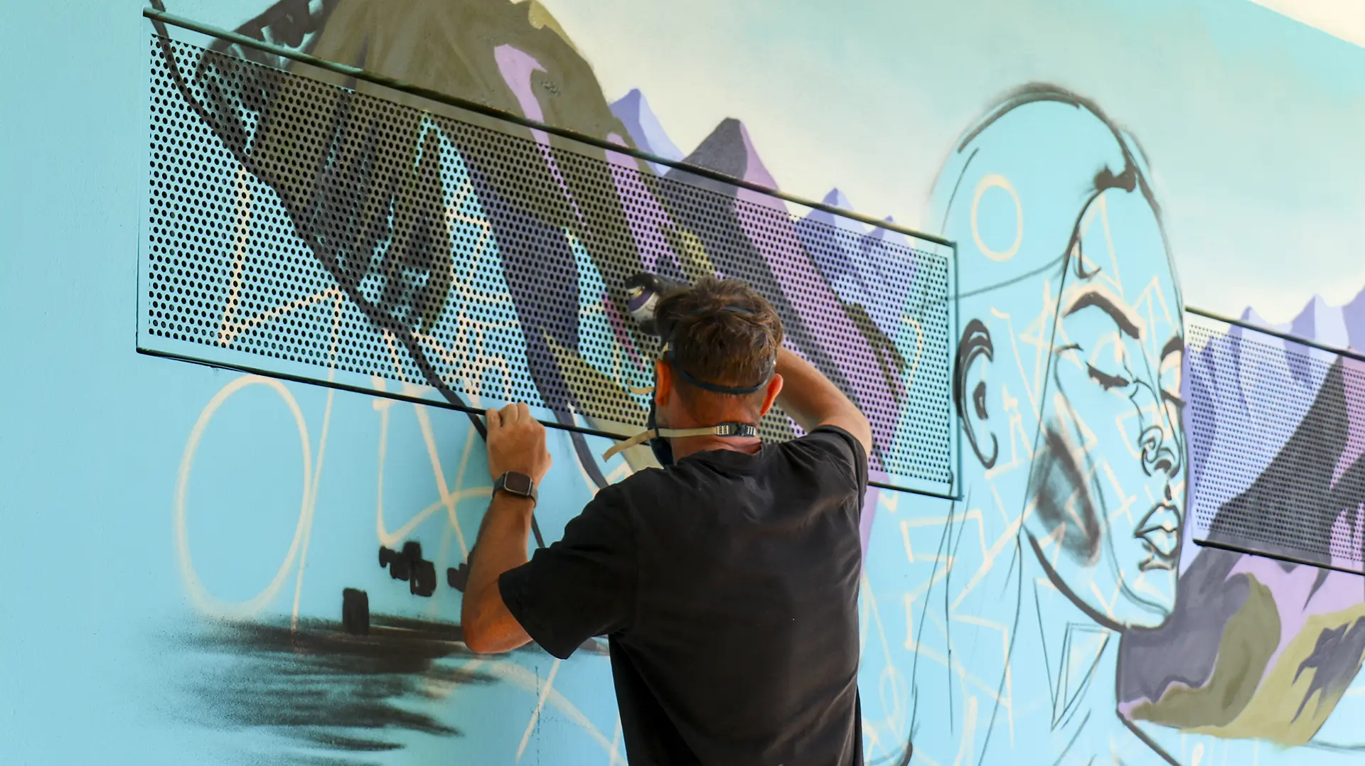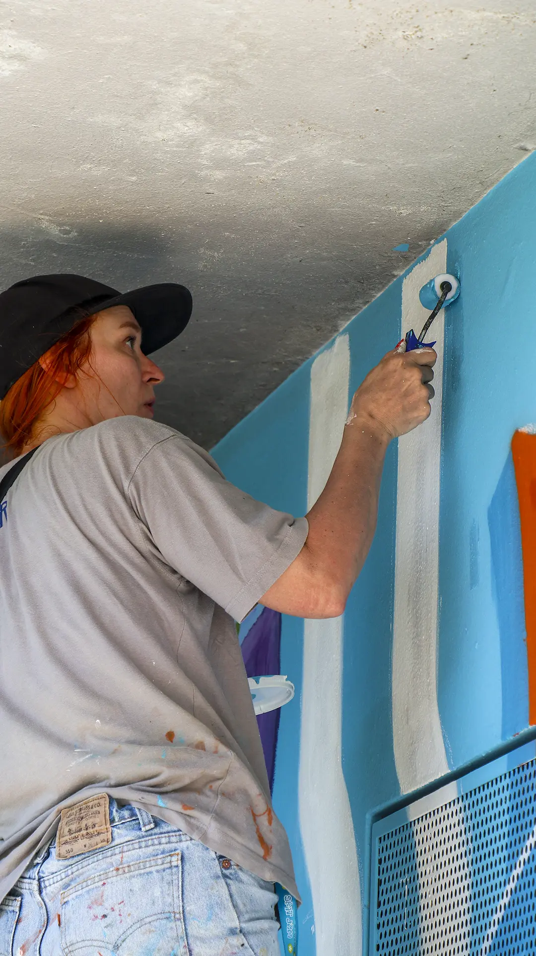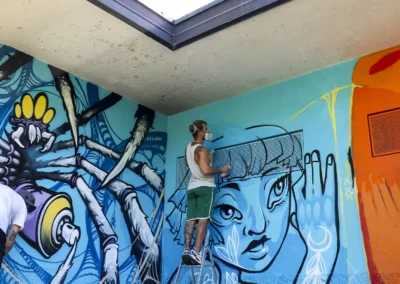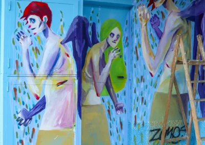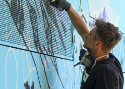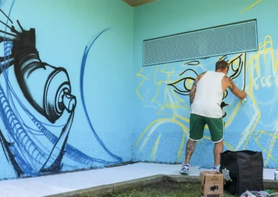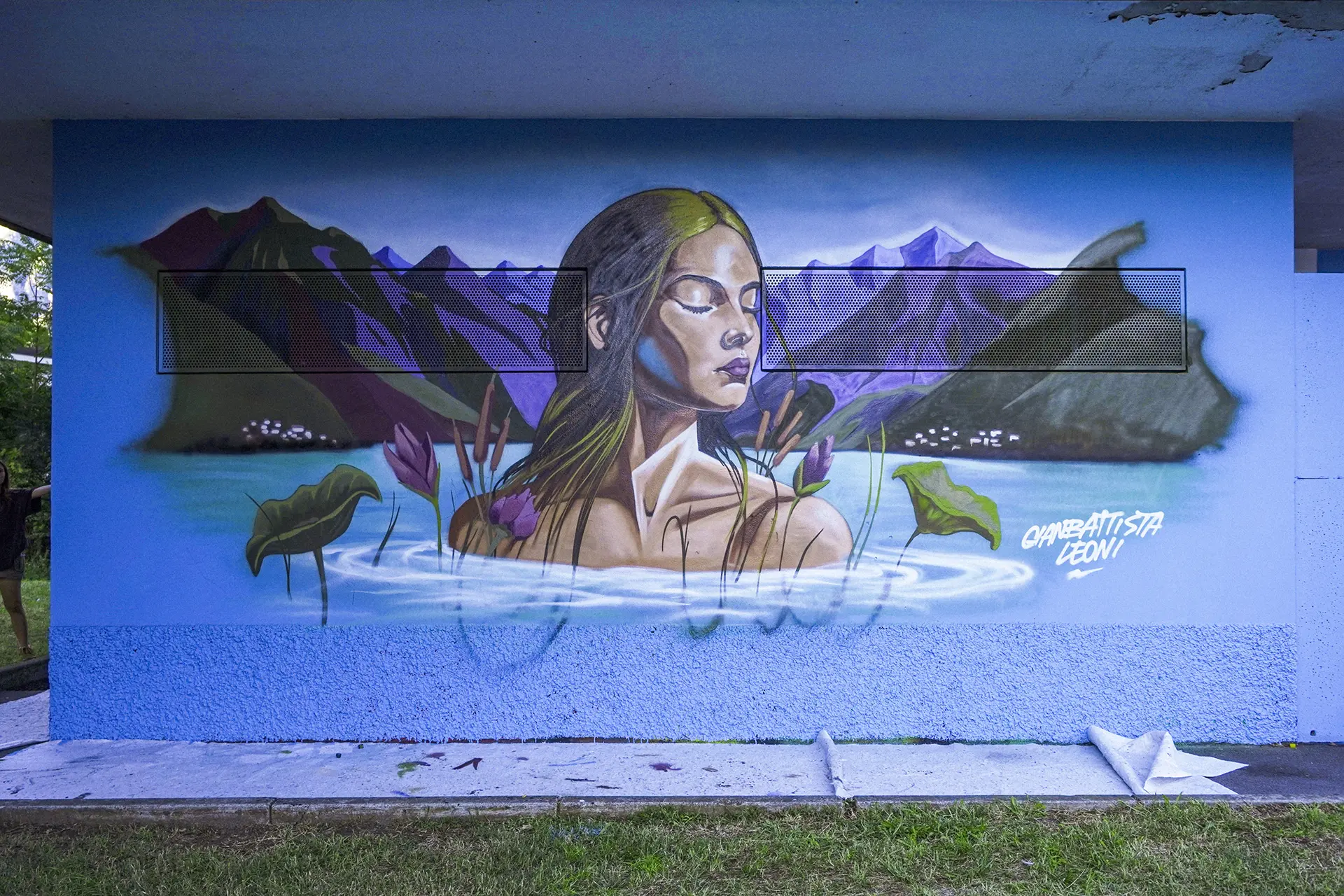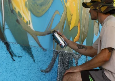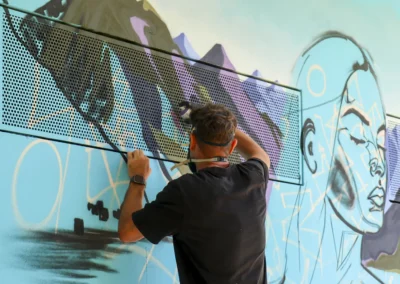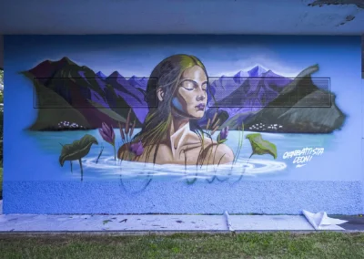 Attraverso sfumature monocromatiche e texture sottili, il murale esprime una dinamica silenziosa e stratificata, ispirata all’acqua, all’acciaio e alla crescita organica. Ne emerge un luogo in continuo movimento, una superficie viva che dialoga con l’ambiente e invita all’interpretazione, accogliendo il cambiamento.
