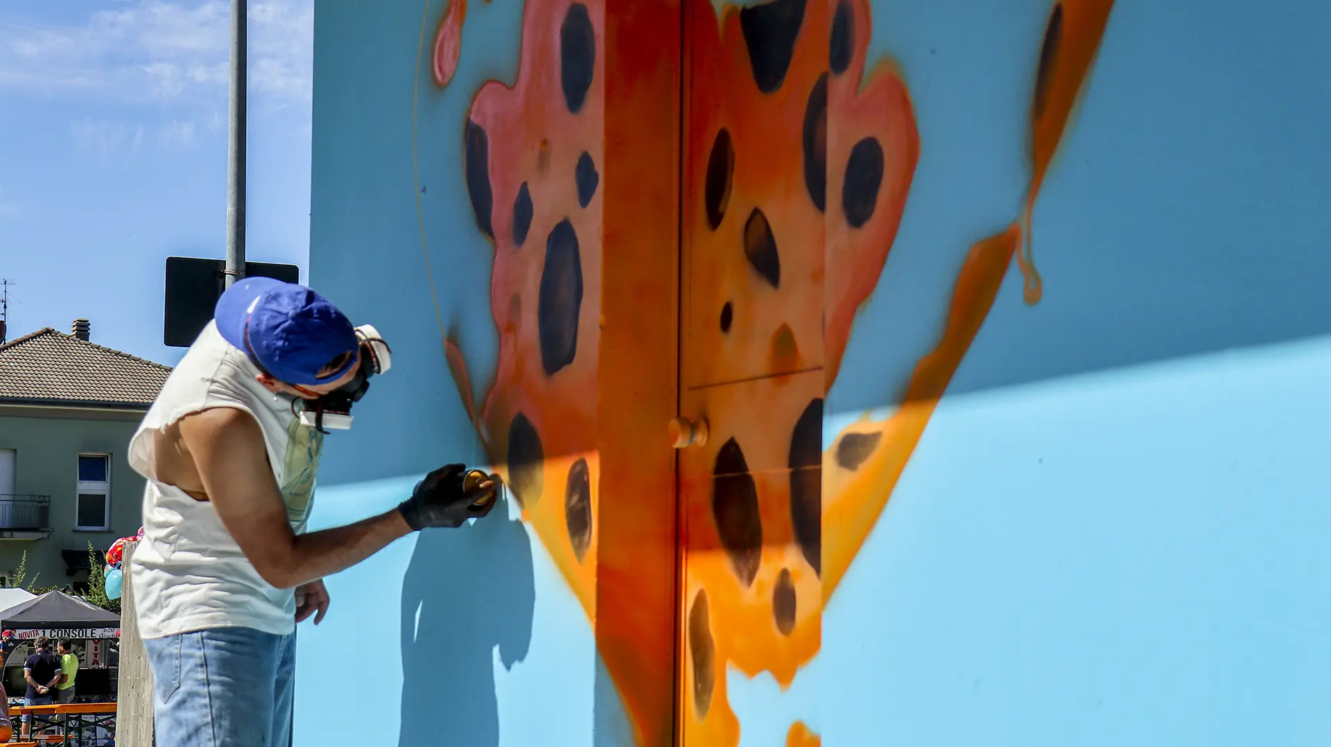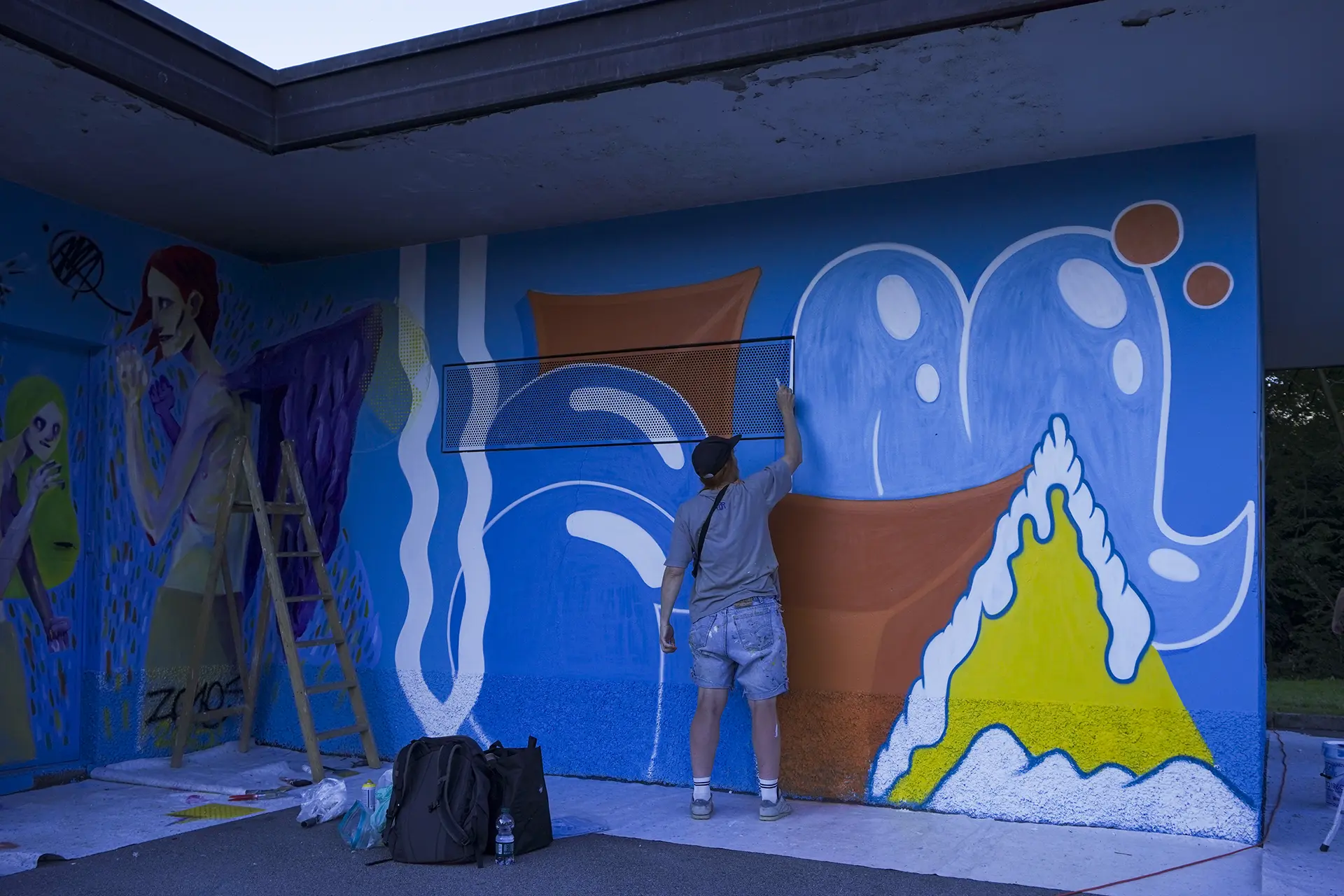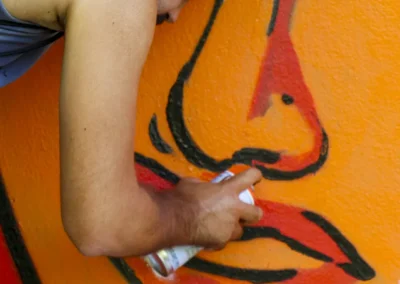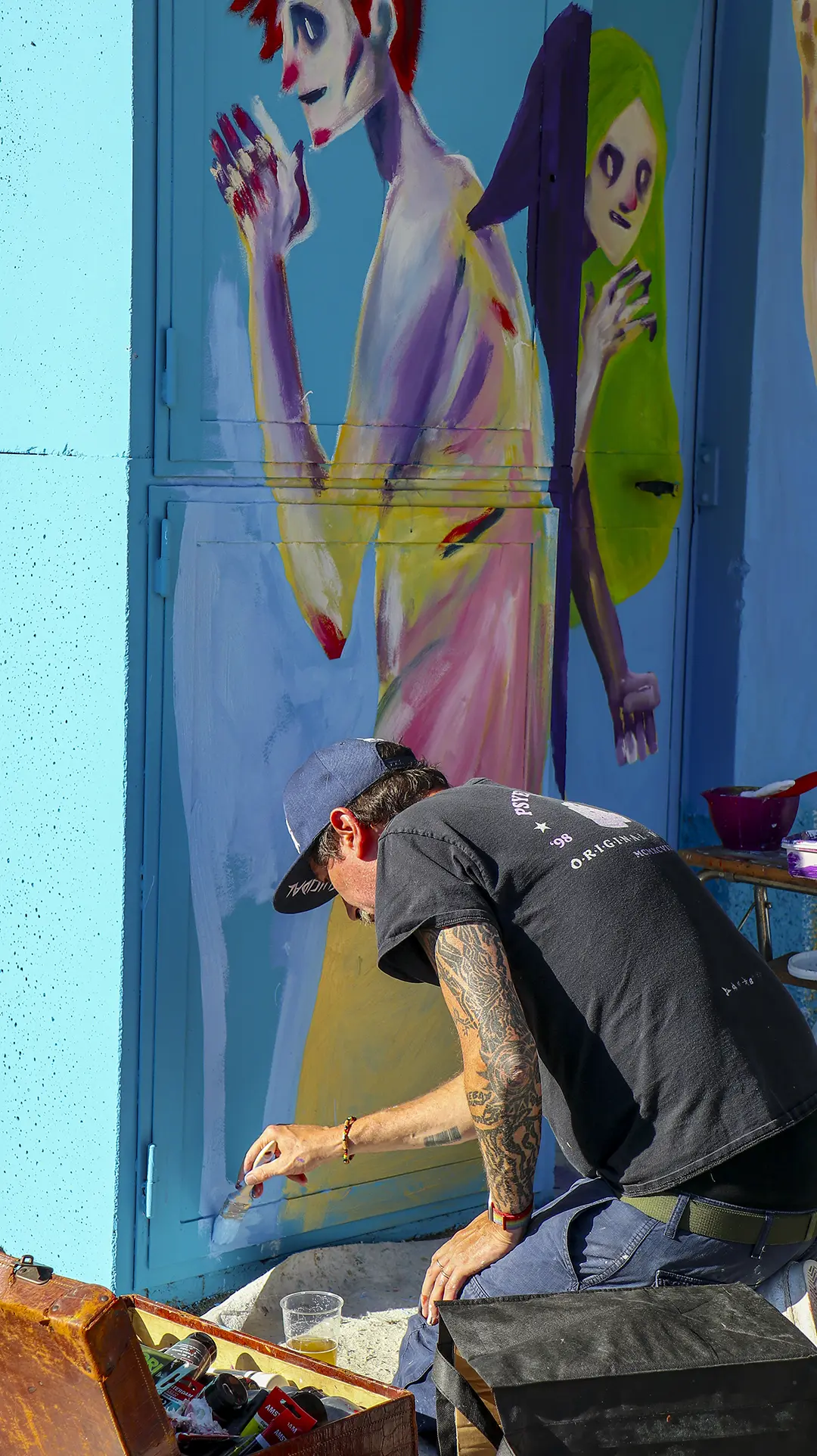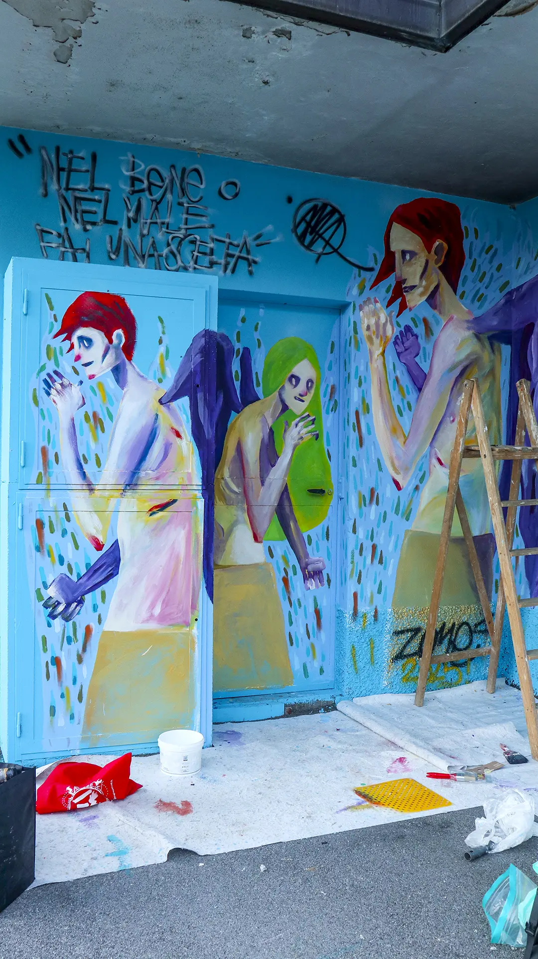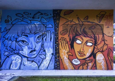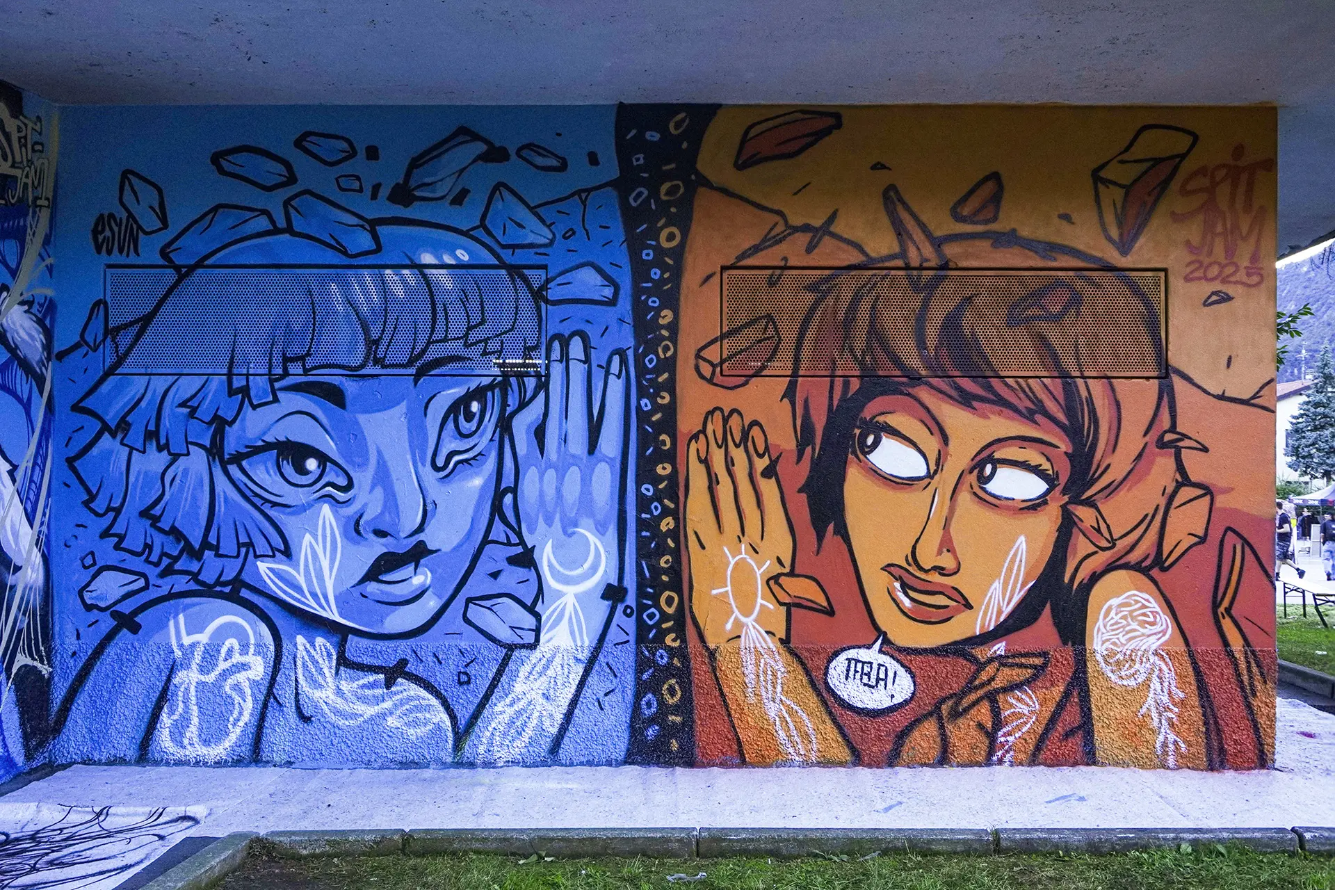 Due mezzi busti speculari, affacciati sull’angolo di un muro, incarnano il respiro della città: una figura arancio e una azzurra — due anime opposte e complementari che si cercano, si completano. I tatuaggi (sole e cervello da un lato, luna e cuore dall’altro) sono simboli interni resi visibili sulla pelle urbana, messaggi intimi che diventano collettivi. I detriti e le crepe che li circondano parlano di trasformazione, di materia viva che si sgretola per lasciare spazio al nuovo.