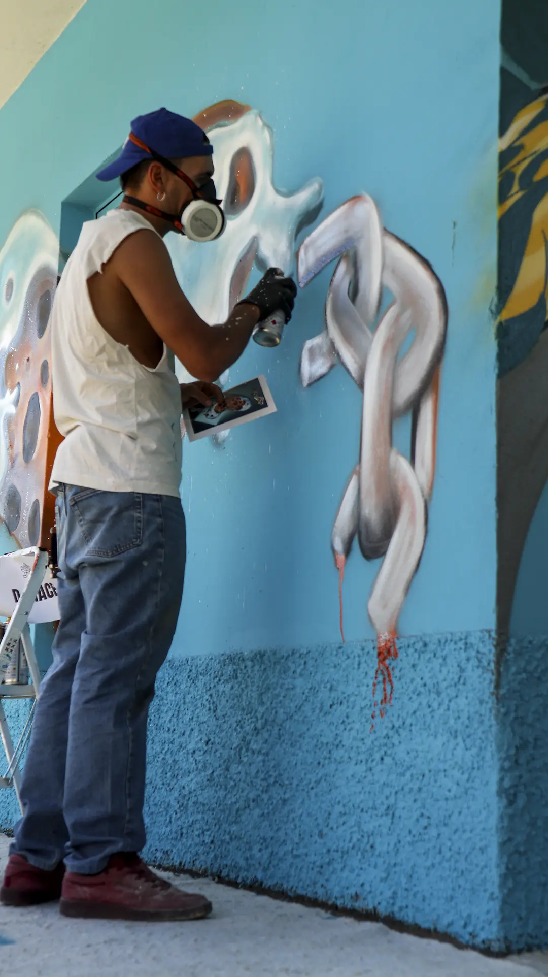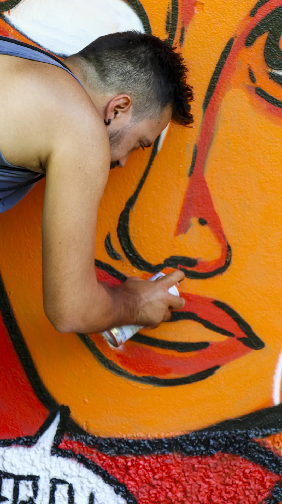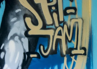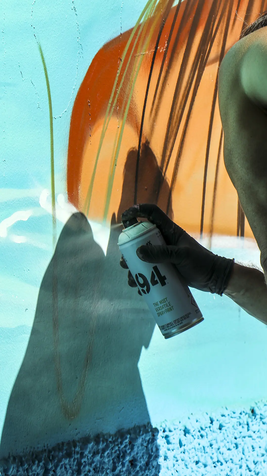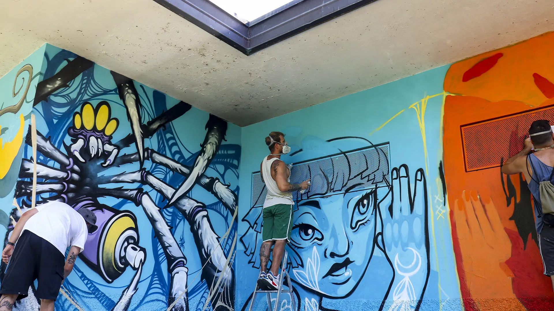 Due mezzi busti speculari, affacciati sull’angolo di un muro, incarnano il respiro della città: una figura arancio e una azzurra — due anime opposte e complementari che si cercano, si completano. I tatuaggi (sole e cervello da un lato, luna e cuore dall’altro) sono simboli interni resi visibili sulla pelle urbana, messaggi intimi che diventano collettivi. I detriti e le crepe che li circondano parlano di trasformazione, di materia viva che si sgretola per lasciare spazio al nuovo.