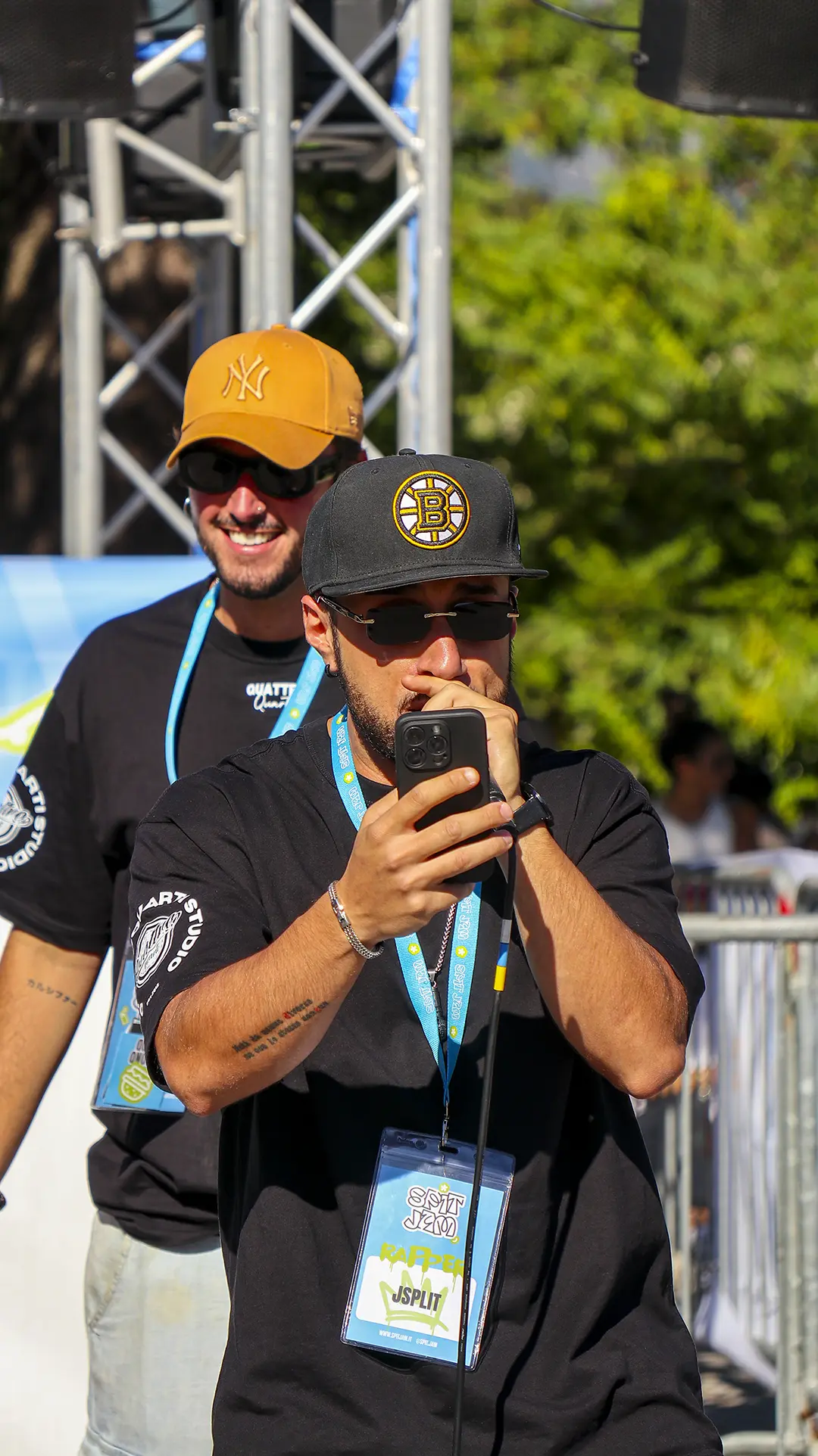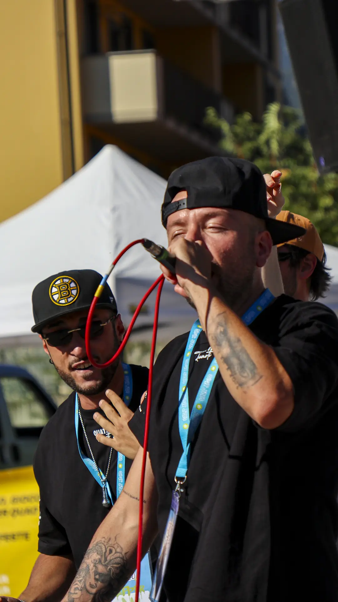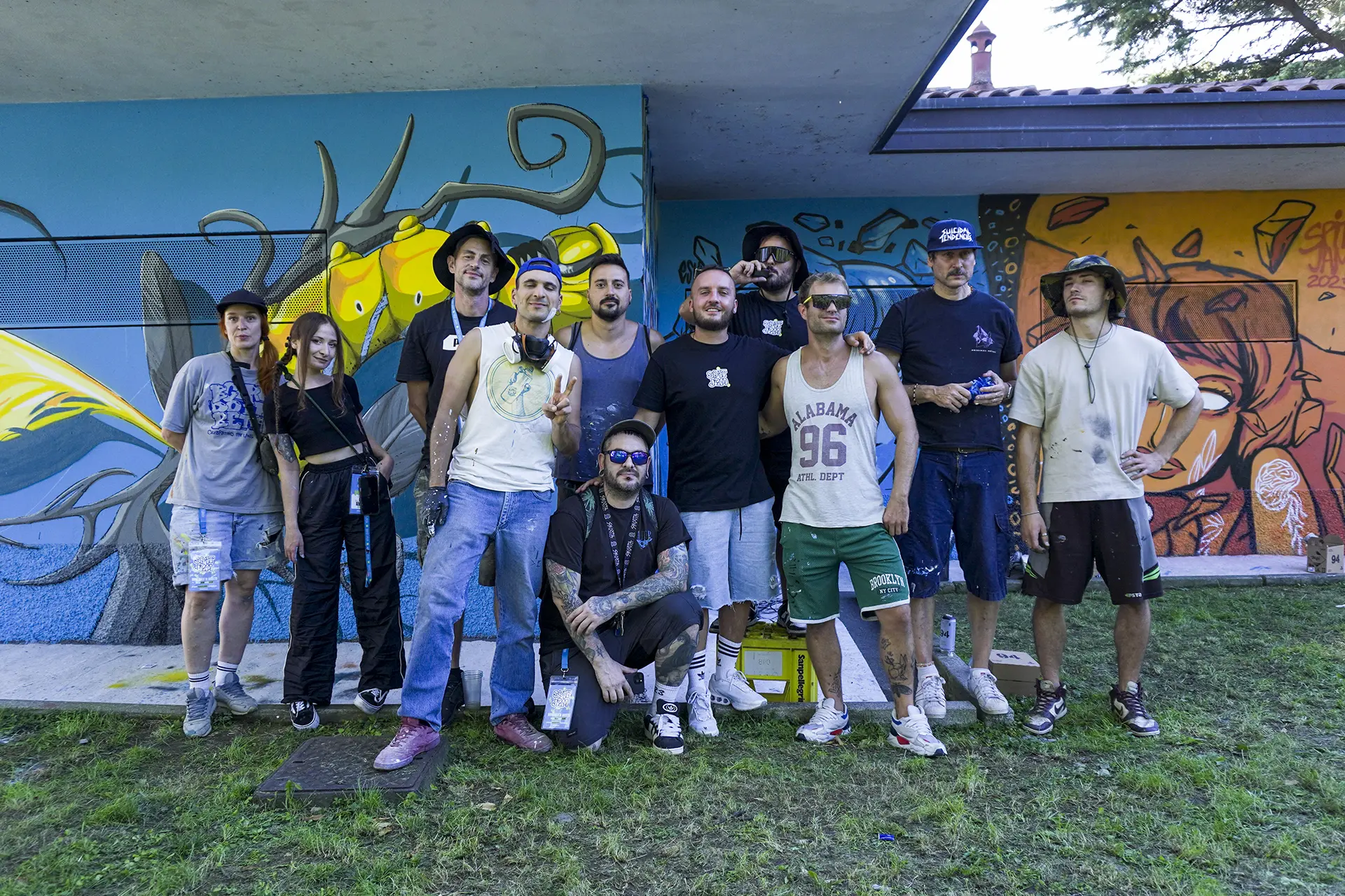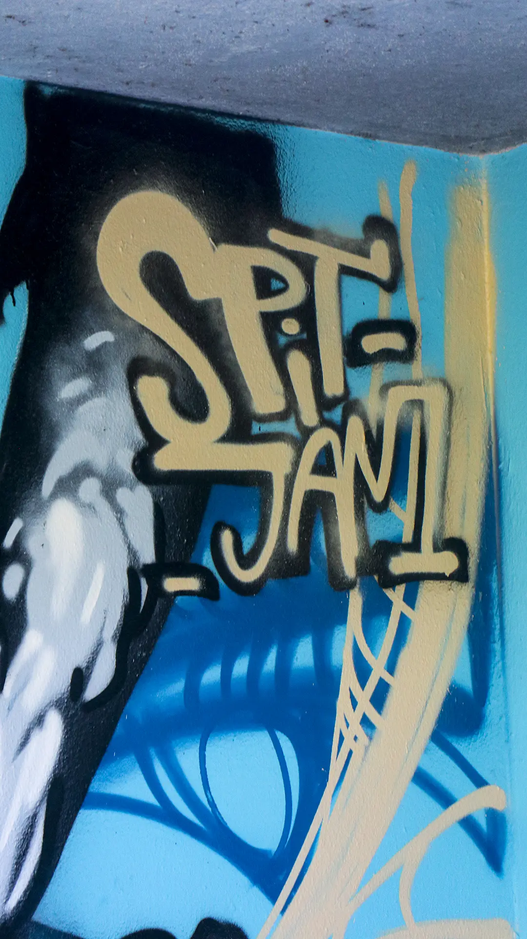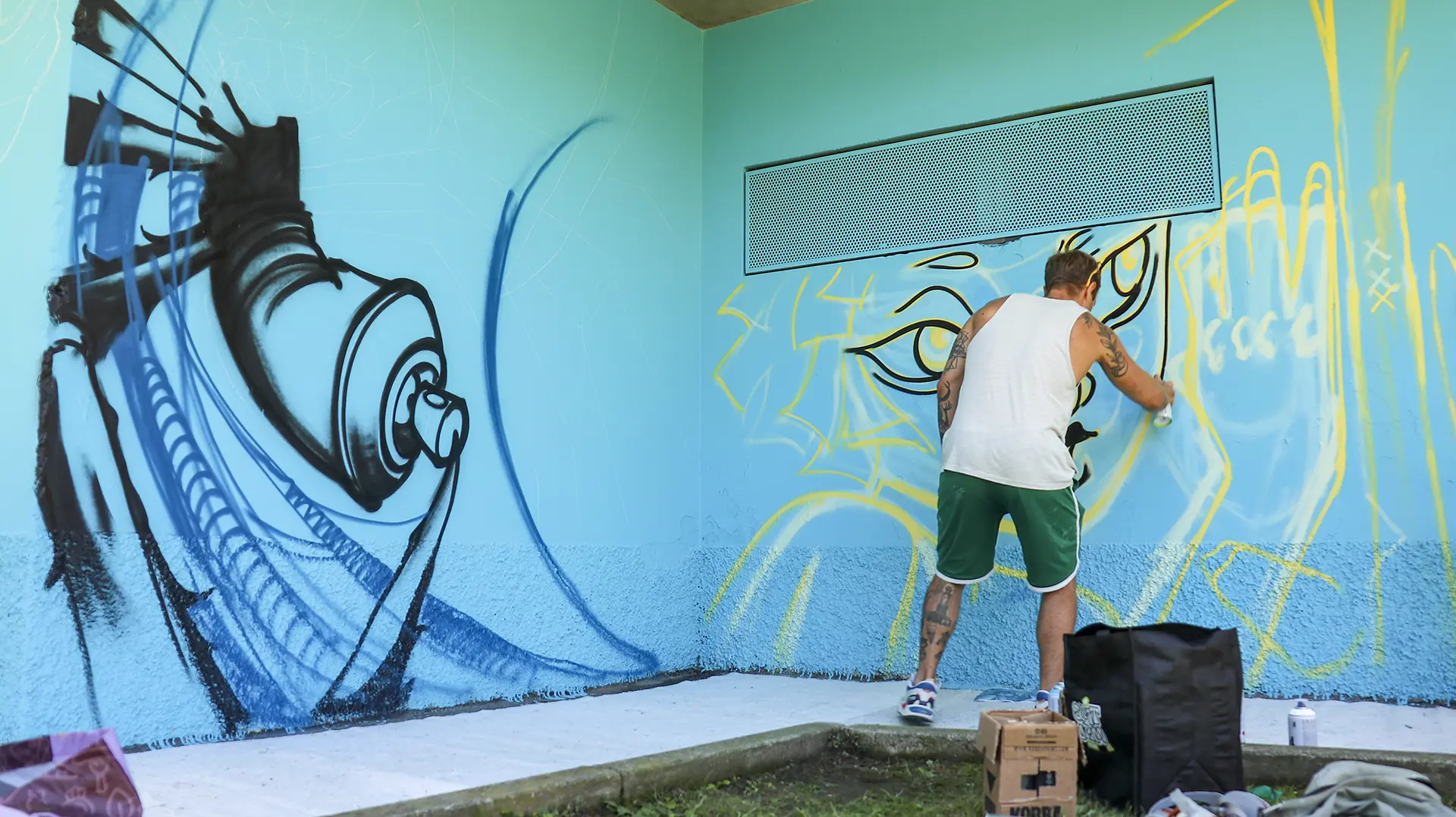 Due mezzi busti speculari, affacciati sull’angolo di un muro, incarnano il respiro della città: una figura arancio e una azzurra — due anime opposte e complementari che si cercano, si completano. I tatuaggi (sole e cervello da un lato, luna e cuore dall’altro) sono simboli interni resi visibili sulla pelle urbana, messaggi intimi che diventano collettivi. I detriti e le crepe che li circondano parlano di trasformazione, di materia viva che si sgretola per lasciare spazio al nuovo.