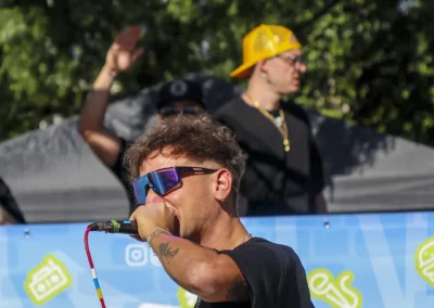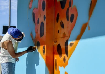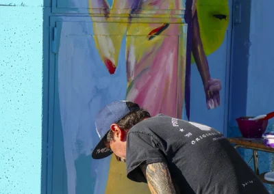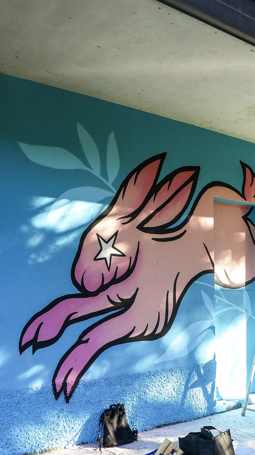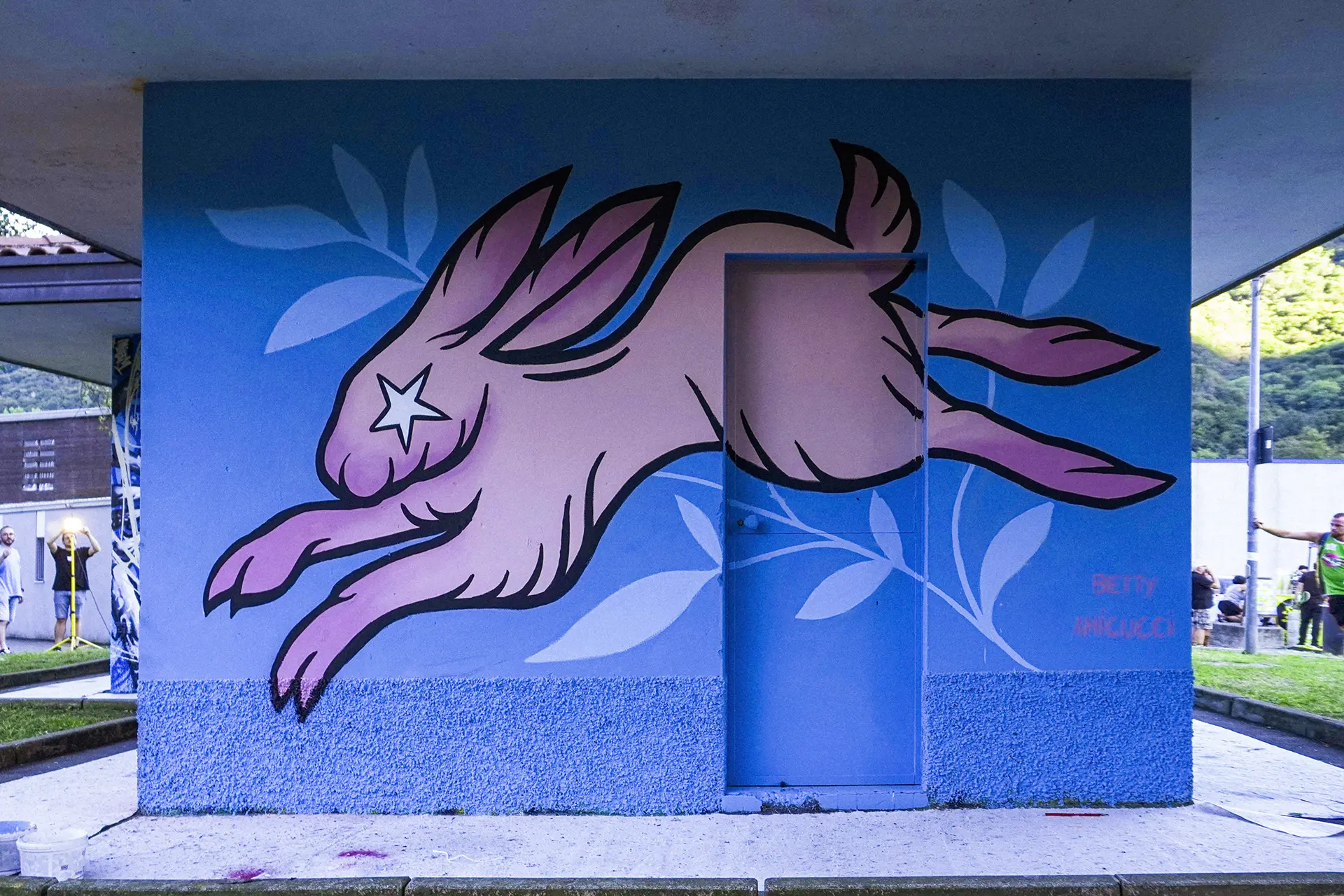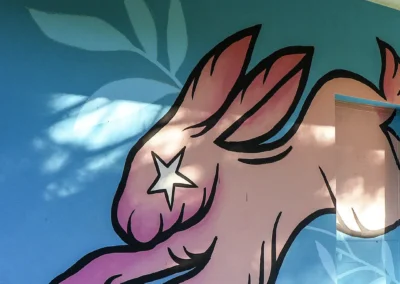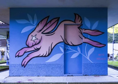 intrecciando paesaggio e immaginazione. Il coniglio diventa icona di rigenerazione e crescita, come la città stessa che si rinnova. Il colore rosa, audace e gentile, esprime una forza che nasce dalla tenerezza: un organismo murale che corre libero nello spazio dell’arte e nella memoria del territorio.