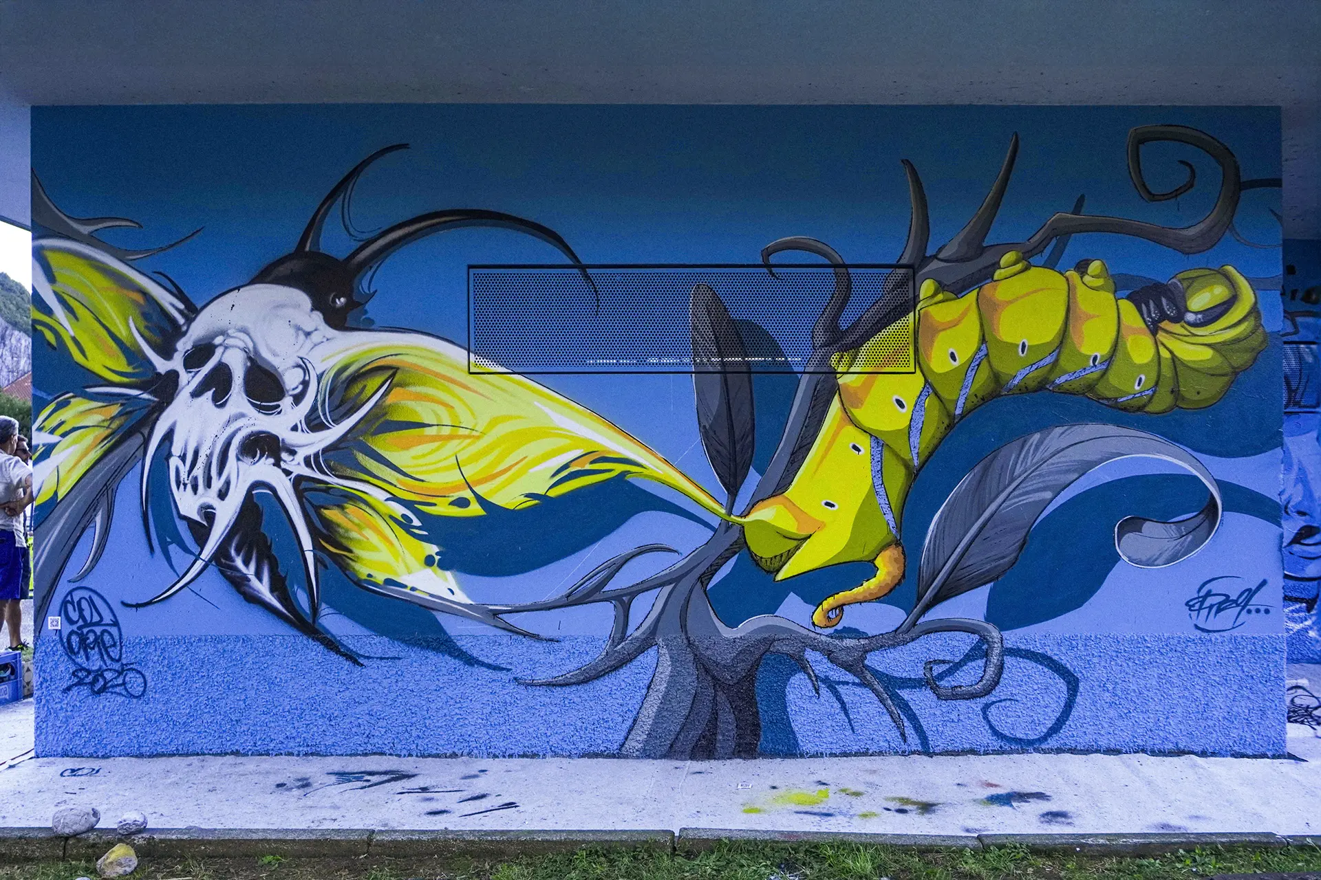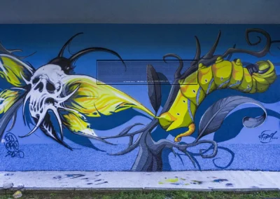 Trasposizione artistica, raffigurante il cambiamento (metamorfosi) di un organismo (bruco/falena) che va a fondersi con il paesaggio urbano.